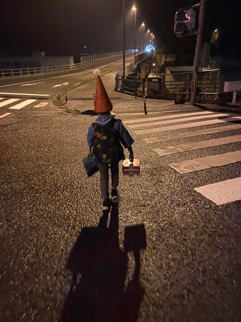 本日は保育園でクリスマス会が行われた模様。保育園の帰りに商店に直行したので、この格好で受け取りに(笑)
