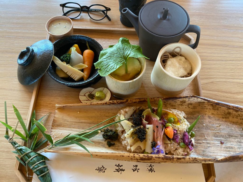 提供された精進料理。油や砂糖、出汁を使わない中での試行錯誤。私はそれより?も、この葉ワサビは上勝のかな?ということが気になりました。