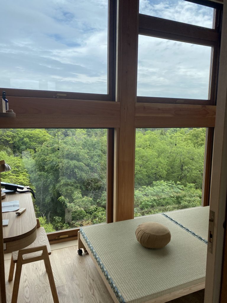 1畳ほどの畳と坐禅を組むためのクッション、デスクスペースのみのシンプルな部屋。でも窓は大きくておひとり様の私は心地よかったです。