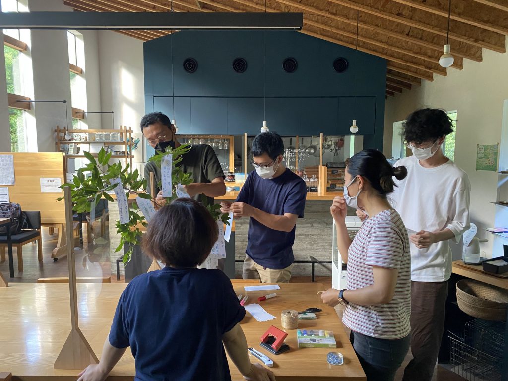 今年は笹を調達できなかったものですから、カフェの外の木の枝をザクッと切りまして、即興で作ったのでした。閉店後、たまたま?お店に来た人やスタッフたちに、「はい、じゃあ短冊とペンね。」と、有無を言わさず渡して、書いてもらいました(脅し?)