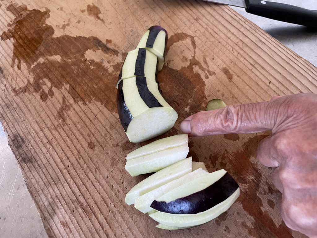 - ナスを洗って皮をシマシマに剥きます。