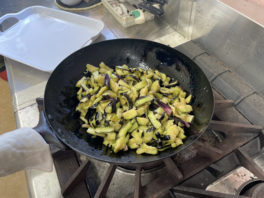 - フライパンにサラダ油を熱してナスを炒めます。