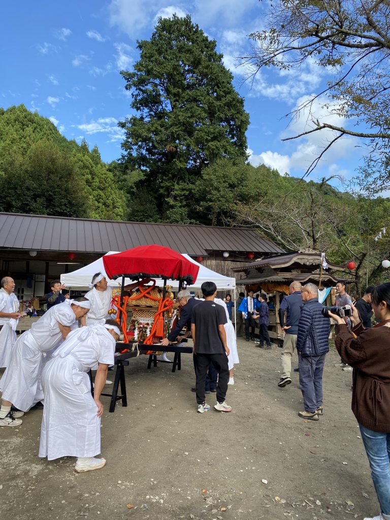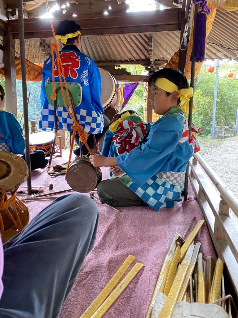 10月から11月にかけては、上勝町内いたるところで「稲刈りして、お祭りもせなあかんけん、せわしい(忙しい)わー。」という会話がいろんな所で聞かれました。地元太鼓保存会の皆様方に教えてもらいながら、うちの息子も秋祭りのお囃子の演奏に加えてもらい(町内では太鼓や笛、鐘などを演奏すること自体を「だんじり」と呼んでいると思いますが)、今年は鐘を担当させてもらいました。