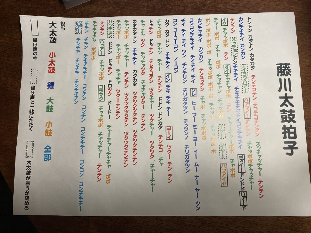 藤川地区の拍子譜面。これを暗記して本番は掛け声をかけながら臨みます。
