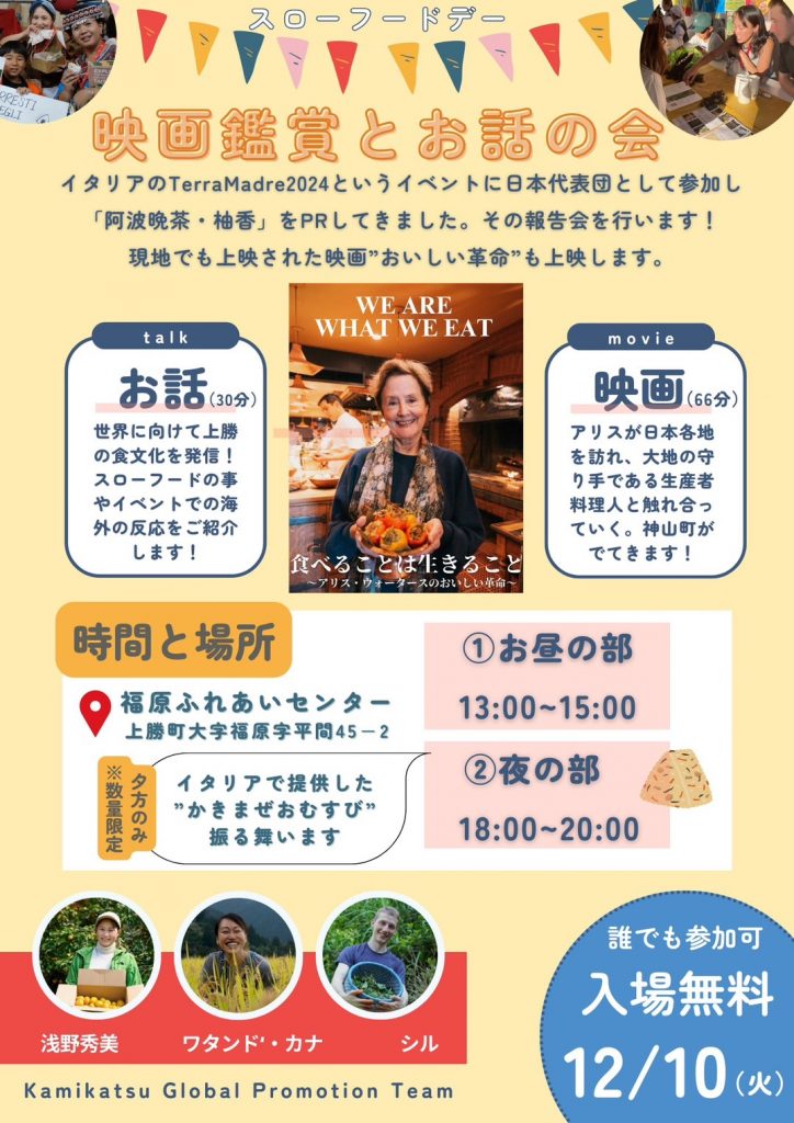 12月7日(土)はいっきゅう茶屋の2階でクリスマスコンサートが開催されたり、市宇という地域では、「収穫祭・餅つき体験交流」と落語家の一席が設けられるようです。その他、12月10日(火)は、スローフードデーにのっとって、町内でアリス・ウォータースさんの映画上映や、町内有志によるイタリアでの国際イベント出店報告会があります。